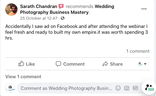 His Marketing Formula to get your own clients using the power of Social Media Optimisation and Social Media Marketing helps photographers and cinematographers to get their own clients without depending on any Online Wedding Portals like WedmeGood, WeddingWire etc to get the leads for their Business. His Marketing Formula makes people self dependent on their business.